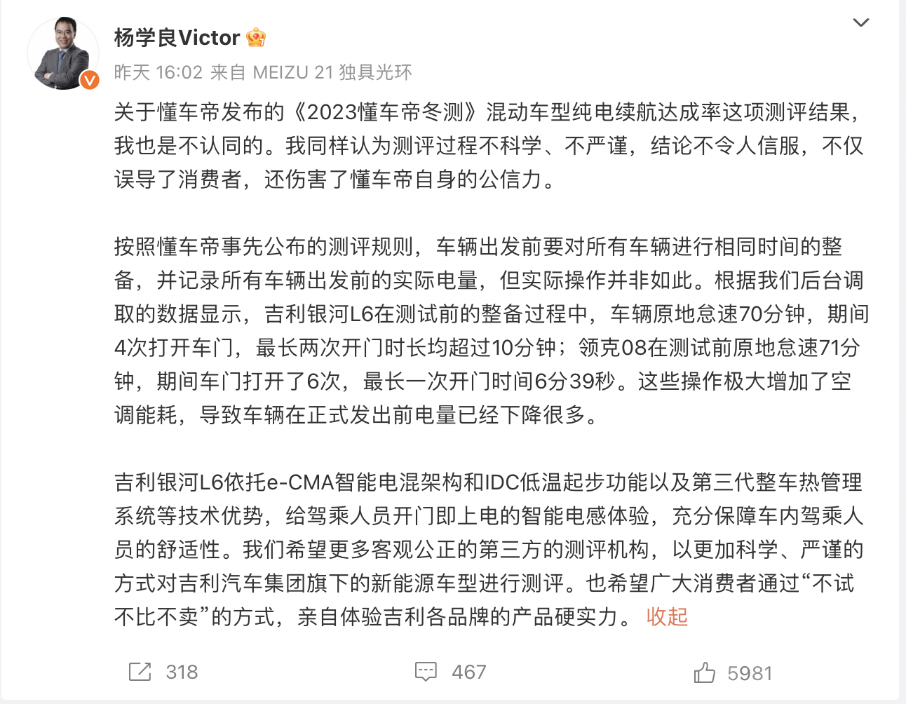 最后回应来自吉利方面。吉利旗下两款车型在懂车帝冬季插电混动测试中表现不佳,纯电续航达成率均处于较低水平。领克08 EM-P以37.68%的纯电续航达成率位列倒数第三,银河L6则以38.48%的成绩排在倒数第四位。针对这一结果,吉利控股集团高级副总裁杨学良发表看法,指出测试流程缺乏科学性与严谨性,其得出的结论难以令人信服。此举不仅欺骗了购买者,也损害了懂车帝自身的信誉。