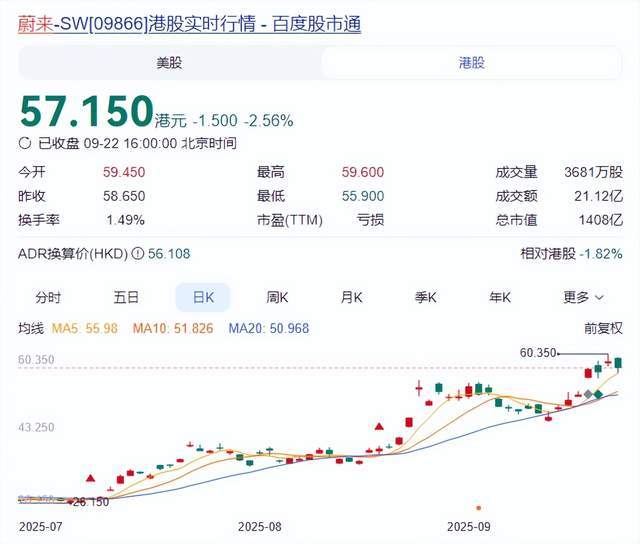 与此同时,蔚来的发展态势让投资者信心增强。最近一段时间,蔚来股票价格持续攀升,9月19日,其港股盘中价格触及60.35港元,创下了今年最高点。到2025年9月22日港股交易结束,蔚来在港市上的总价值达到了1408亿港元。