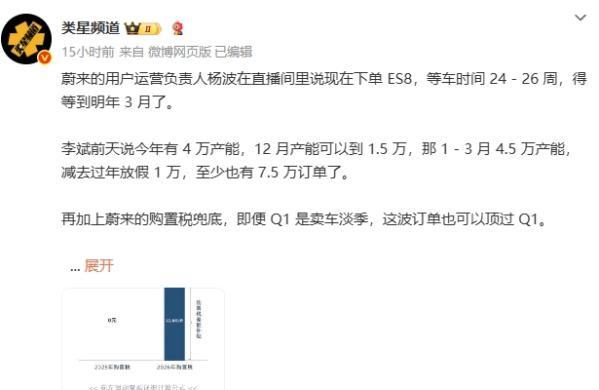 【智车派新闻】本月二十日,蔚来品牌最新一代ES8车型于杭州市完成发售,基础版本定价为四十万六千八百元,若选择电池租用计划,购车成本可降低至二十九万八千八百元。内幕人士透露,该款新车甫一亮相,市场需求便异常旺盛,短短几天内,订单数量已突破生产线的承载极限,导致制造环节出现瓶颈。蔚来客户服务主管杨波通过视频讲话表示,现在下单的人要等二十四周到二十六周,大概要六个月,拿到车的时间会推迟到二零二六年三月。