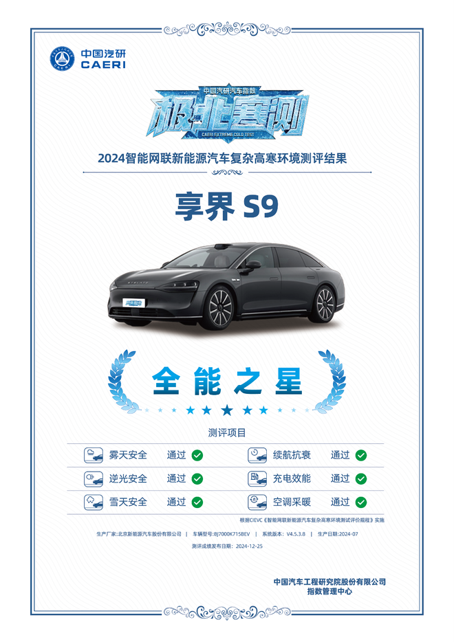 我们再从另一组数据来看,在2024中国汽研汽车极北寒测中,享界S9顺利完成了续航抗衰、充电效能项目,被评为【高效节能之星】。这也为它的全场景过人技术表现,提供了权威的佐证。