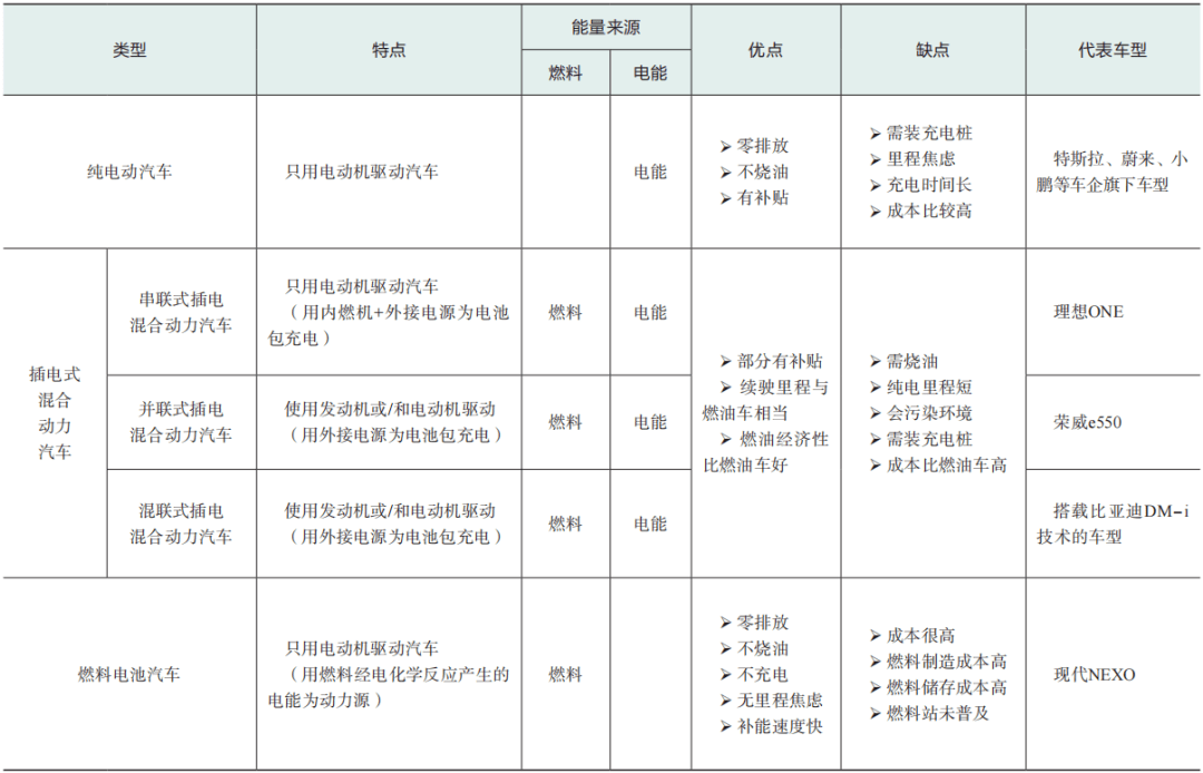 纯电动汽车和燃料电池汽车构造比较简单,动力来源为电力或燃料,二者都通过电动机配合减速器来驱动车轮运行。相比之下,插电混合动力汽车构造更为复杂,它同时配备了发动机和电动机,车辆行驶的动力来源既有燃料也有电力。