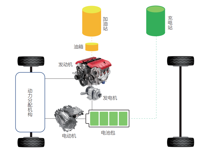 串联式混合动力汽车可以用一个比喻来理解:想象一对男女共同骑着一辆单人自行车,男性角色负责用力蹬踏板,女性角色则坐在后座无需操作,不过当男性感到疲劳时,女性可以提供补给,也就是向男性角色输送能量,这样车子才能不断前进