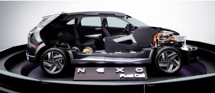 氢燃料电池汽车最终生成的物质仅是水,此外,在行驶期间,它还能使空气得到净化,为处理环境问题提供了新的思路。图中展示的是氢燃料电池汽车的一个典型范例——现代NEXO,图中也呈现了现代NEXO的动力系统构造。