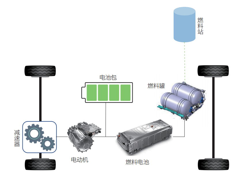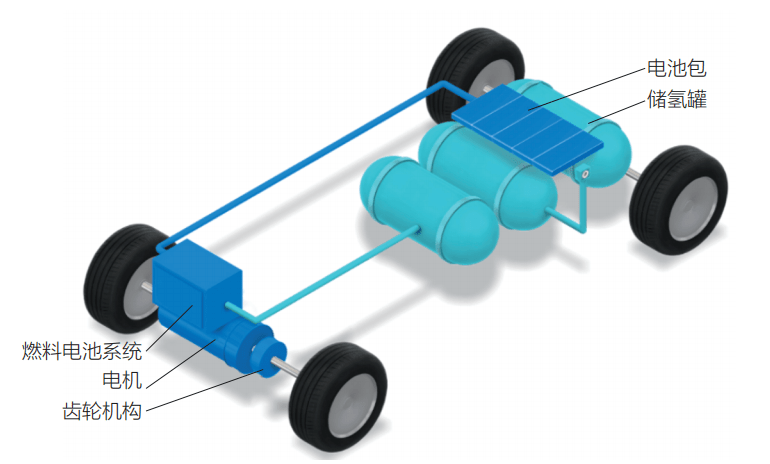 燃料电池汽车一般使用氢气、甲醇等作为能源,依靠化学变化制造电力来驱动马达运转,马达产生的动力经过变速机构传递给行驶轮,这样车子才能前进,其运作方式如图所示。