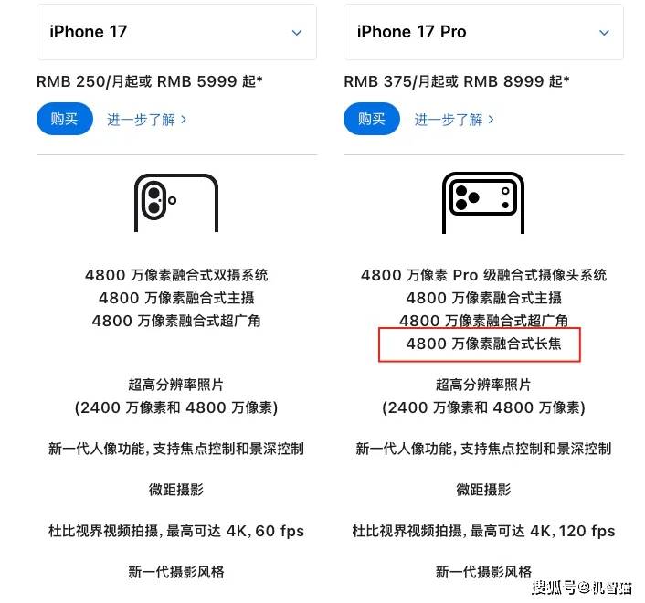 iPhone 17 Pro与标准版的不同之处在于增加了长焦镜头,传感器尺寸较iPhone 16 Pro有所增大,由1/3.1 英寸扩展至1/2.55 英寸,同时像素数提升至4800万,镜头焦段则从5倍调整为4倍(相当于100mm),虽然数值看似减小,但拍摄时视野范围更宽广,限制性更少。