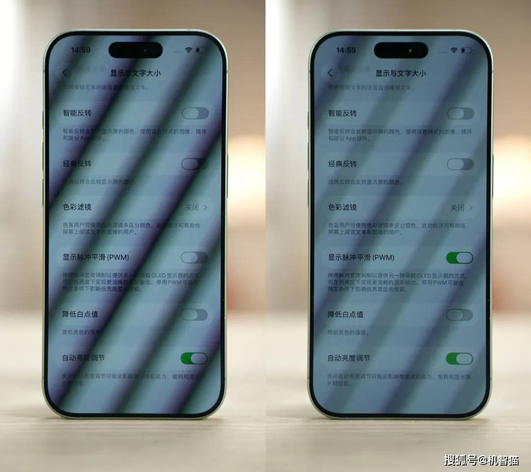 注重眼睛保护的人,现在终于能在“辅助功能-显示与文字大小”里找到“显示脉冲平滑”这个设置了,它其实就是大家常说的PWM调光。实际拍摄的画面显示,屏幕闪烁的幅度会显著减小(“黑条”变得细了),在光线较暗的时候,画面多出一些细微的纹理,整体感觉会更加舒适,如果经常在昏暗的地方看手机,一定要记得开启这个功能。