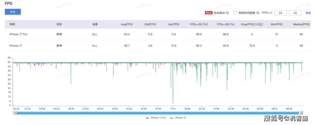 通过查看帧率变化曲线,可以发现,在十七分钟时段内,iPhone 17多次出现画面卡顿现象,虽然多数时刻仍能维持在每秒六十帧的流畅度,但稳定性欠佳,不过这种效果相比往昔的标准机型已有显著提升。