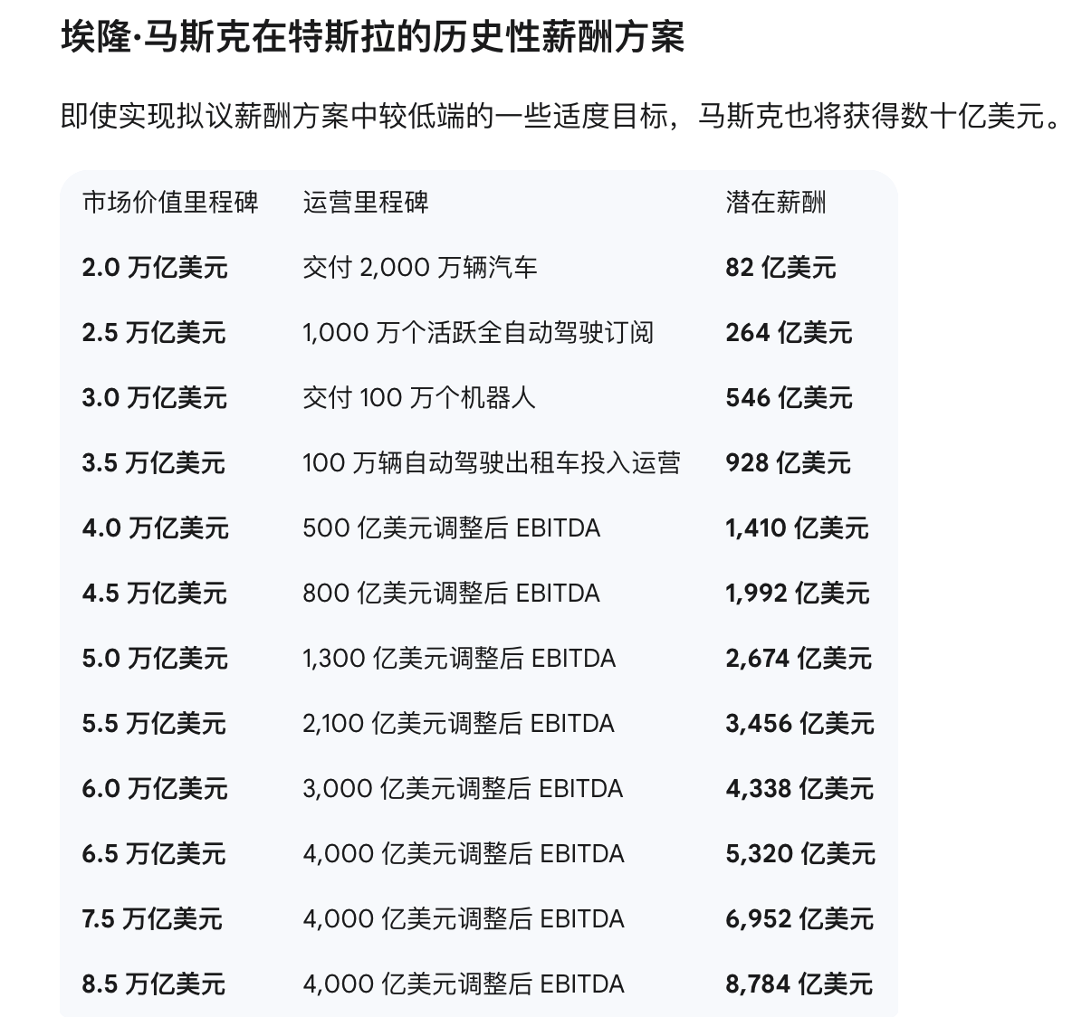 今年9月,特斯拉董事会向马斯克提出了公司历史上最慷慨的CEO报酬计划,同时向投资方承诺,马斯克需要达成堪比“星际探索”的卓越成就,才有可能在十年内获得价值八千七百八十亿美元的特斯拉股份。