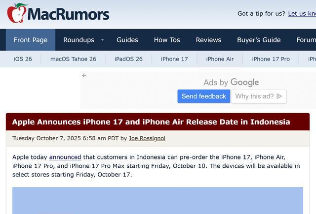 【环球网科技综合报道】10月8日信息,依据MacRumors消息,苹果企业近期公布,打算在10月10日,即本周五,为iPhone 17、iPhone Air、iPhone 17 Pro以及iPhone 17 Pro Max这四款产品在印度尼西亚开启预购服务,同时安排在10月17日,即下周五,由当地授权销售商开展线下销售,这象征着苹果公司正逐步推进其东南亚市场的开拓计划。