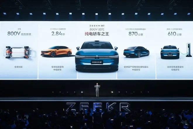 极氪007是极氪高性能800V架构的开山之作,配备了完全自主研发的高级智能驾驶系统,搭载了8295智能座舱计算平台,并且标配了NVIDIA DRIVE Orin SoC智能驾驶系统级芯片,实现了NZP(高速自主领航辅助系统)领航功能即开即用。自主研发的75kWh金砖电池,在CLTC综合工况下,可实现最长达688公里的续航表现;依托800V架构的优势,能够支持5分钟快充恢复240公里续航,或者15分钟内补能达成610公里续航能力。这款具有高性价比的产品,其市场热销情况几乎是板上钉钉。