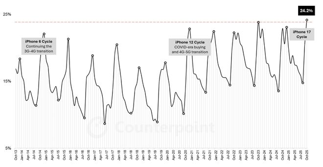 IT之家于11月29日发布消息称,市场调查机构CounterPoint Research在昨日也就是11月28日时发布了博文,该博文报道指出,因iPhone 17系列在包括中国、美国等市场有着强劲的表现,所以苹果在2025年10月时候的iPhone销量同比增长了12%,其终端销量份额更是飙升到了24.2%,从而创下了历史新纪录。