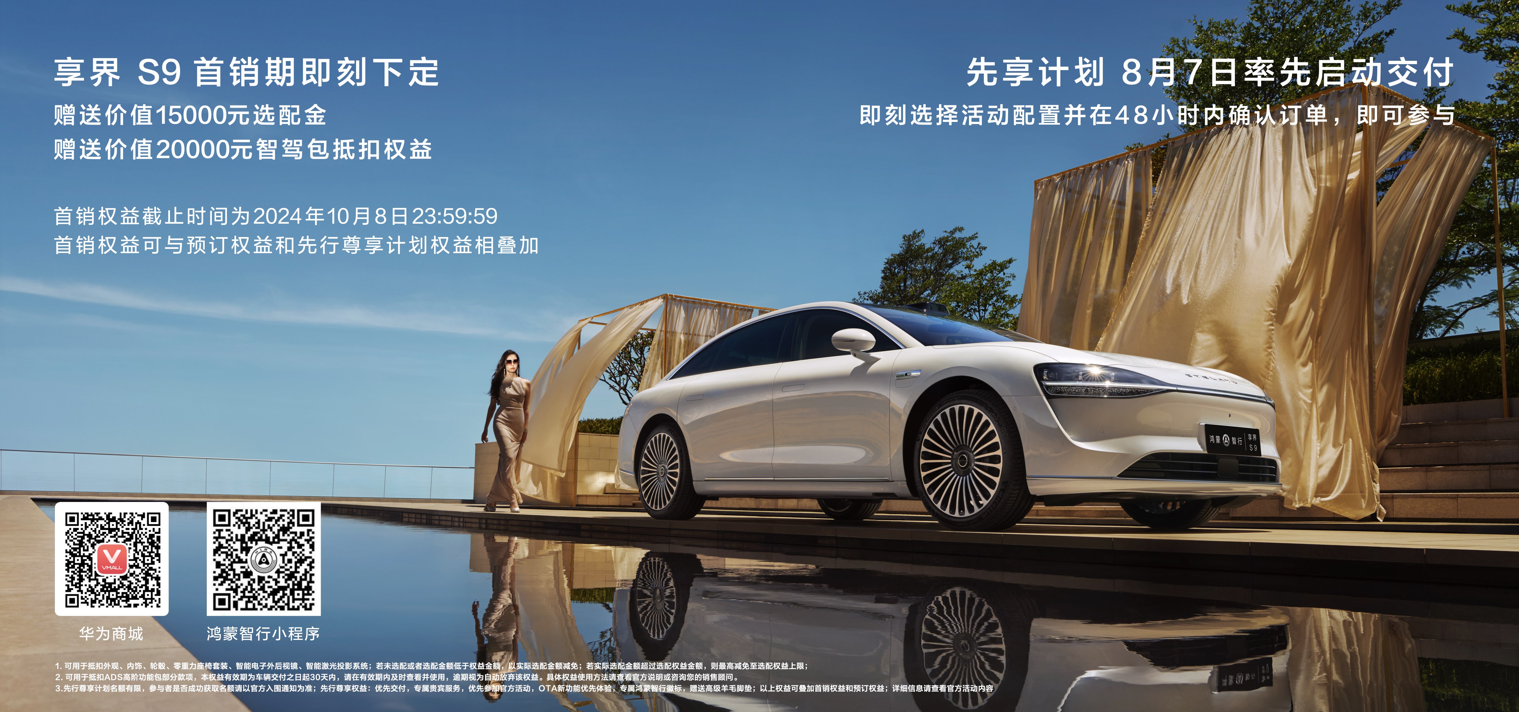 享界S9推出俩版本车型,享界S9 Max建议零售价是39.98万元,另享界S9 Ultra建议零售价为44.98万元。当下预定享界S9,能获赠价值15000元选配金与价值20000元智驾包抵扣权益,首销权益终止时间为2024年10月8日23:59:59。首销权益能叠加预订权益及先行尊享计划权益。欢迎有兴趣的用户去附近华为门店、鸿蒙智行用户中心试驾、体验。