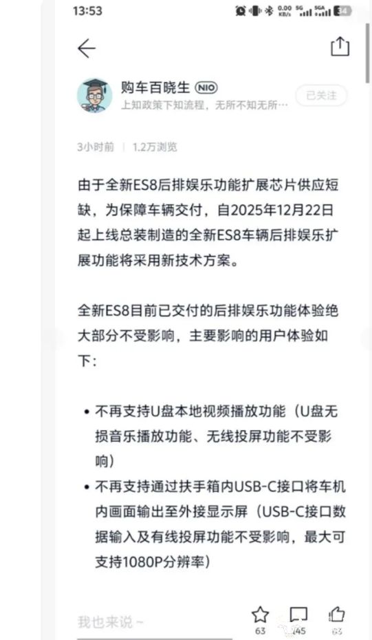 2025年9月20日,蔚来全新ES8正式亮相推出,紧接着在上市第二天就正式着手开启交付工作。可是呢,到了12月17日,蔚来官方突发性地发布一份通知,声明是因为全新ES8车型后排娱乐功能扩展芯片的供应出现了短缺状况,为了能够保证车辆交付工作可以顺利地开展进行,从2025年12月22日开始,上线总装制造的全新ES8车辆后排娱乐扩展功能将会采用新的技术方案的。