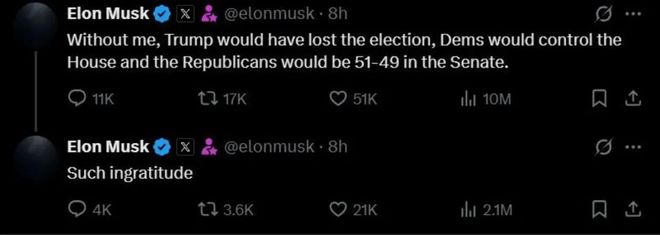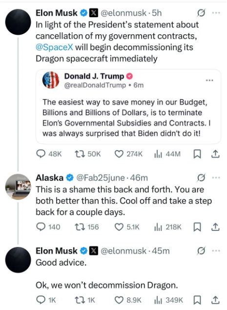 一种留言觉得,特朗普与马斯克之间的争执,存在可能是在“演戏”,马斯克于X上发帖称要终止SpaceX与美政府的合同,致使NASA无法再使用SpaceX的龙飞船,有个X平台上仅有200名粉丝的用户“Alaska”,在这条帖子下留言说:这样来来回回地争吵实在丢人,你们俩都应当做得更出色,冷静下来,各自往后退一步,过几天后再谈,马斯克回应道:好建议,好吧,我们不会让龙飞船退役。在另外一条回复当中,身为亿万富翁的比尔·阿克曼,也就是Bill Ackman,表明两人是“为了咱们伟大国家的益处而达成和解,人们团结置于一起对比分开而言会更具强大力量”。马斯克于这条帖子的下方回复称:“你所讲的是正确的。”。