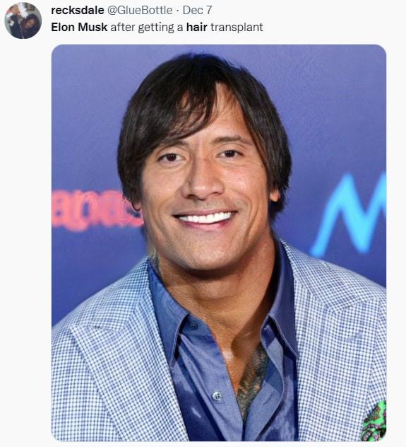 还有人讲,马斯克在进行植发操作之后,所弄的这个发型,着实与他的脸不相匹配,恰似那有着头发的巨石强森那般: