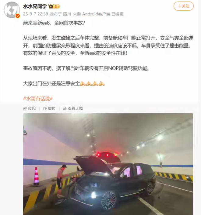 9月7日的晚上,有一则在网络上传播的消息表示,蔚来全新的ES8疑似出现了“在全网范围内首次发生的事故”,这一情况引发了广泛的关注。博文当中所呈现的内容表明,发生碰撞的车辆在碰撞之后,车体维持着完整的状态,车辆的前备舱以及车门能够正常地打开,并且安全气囊全部都弹开了。