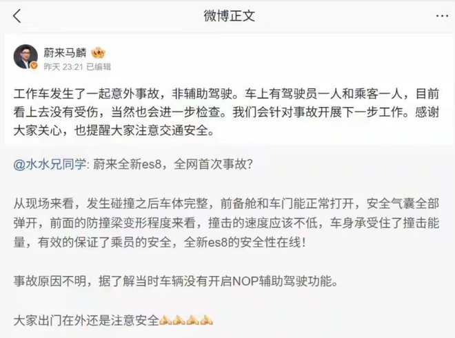 对于此情况,蔚来汽车那一方在那时及时地开展了回应行动。据知晓,于事故发生之后,上海蔚来汽车有限公司的品牌和传播助理副总裁马麟快速地给出了回应。