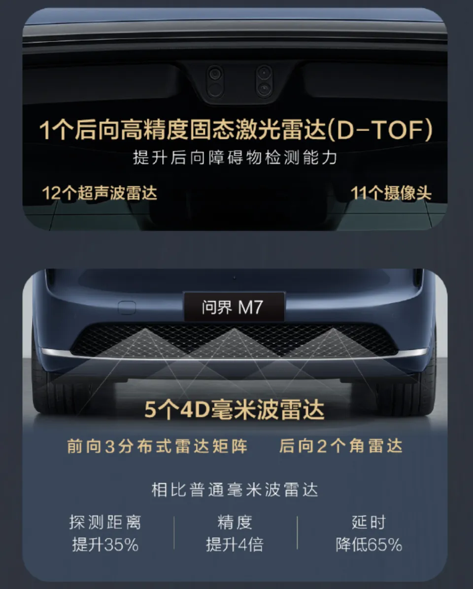 高配版车型将配备和旗舰M8相同的华为ADS 4智能驾驶系统软硬件,车顶安装一枚192线激光雷达,后方配置一款高精度固态激光雷达,前方布置三组分布式4D毫米波雷达矩阵,再配合两具4D毫米波角雷达,构成全方位立体三维感知能力,不仅达到同级别最高水准,更在行业范围内处于领先地位。