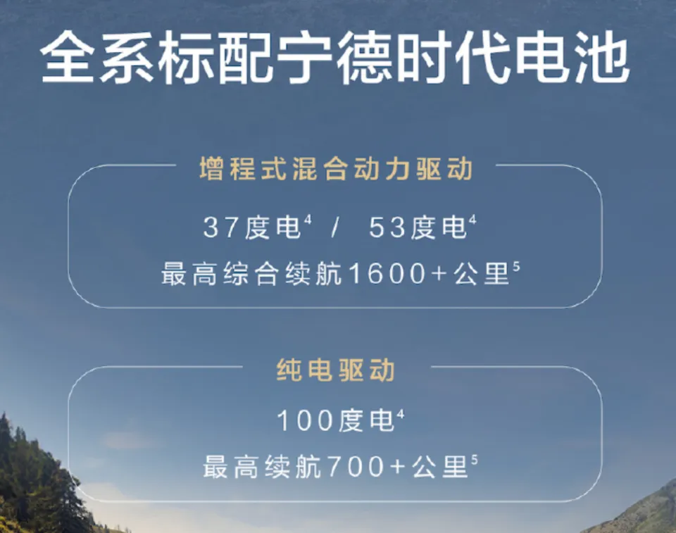 新增车型全面装配宁德时代动力单元。其中,插电式混合动力版本选用1.5升四缸动力辅助系统,搭配37千瓦或53千瓦两种容量电池组,实际综合行驶里程表现突出,每百公里平均消耗燃料量在同级别产品中最为经济,仅为6.5升;纯电动版本首次应用华为研发的高压集成驱动系统,以及容量为100千瓦时的电池组,最大纯电动行驶距离超过700公里,并且能够兼容4C级别的快速充电技术。